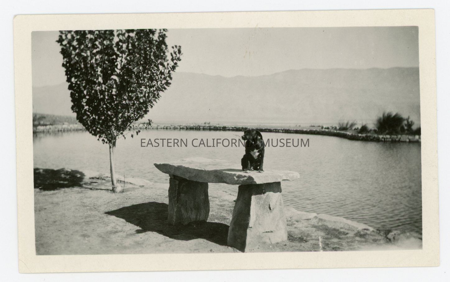 Photo of a dog sitting on a stone bench at the Mt. Whitney Fish Hatchery.