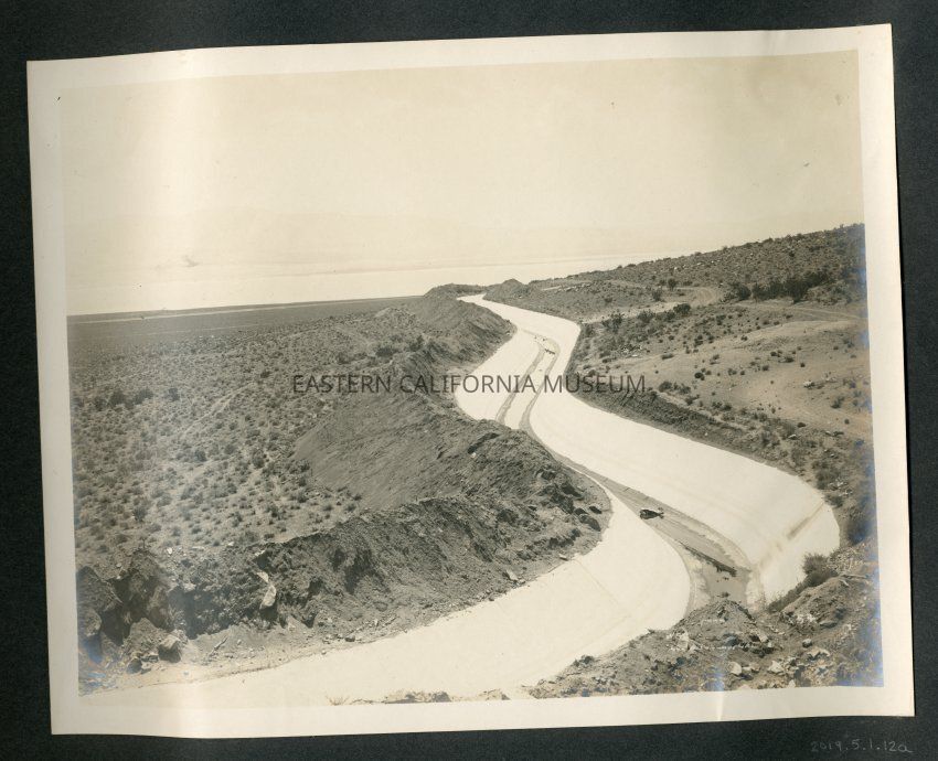 Photo of an open, lined section of the Los Angeles Aqueduct with what may be the Owens Lake in the distance [badly faded]. Has "West Coast Art Co. / Los Angeles, Cal." in the lower right corner.