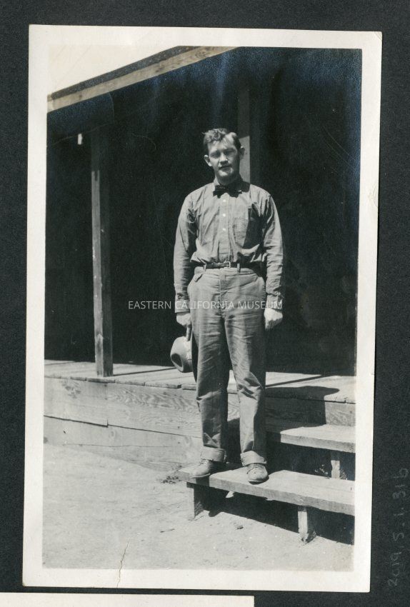 Photo of a man standing on the wooden steps in front of a building with a covered porch. He is wearing a hat in his right hand.