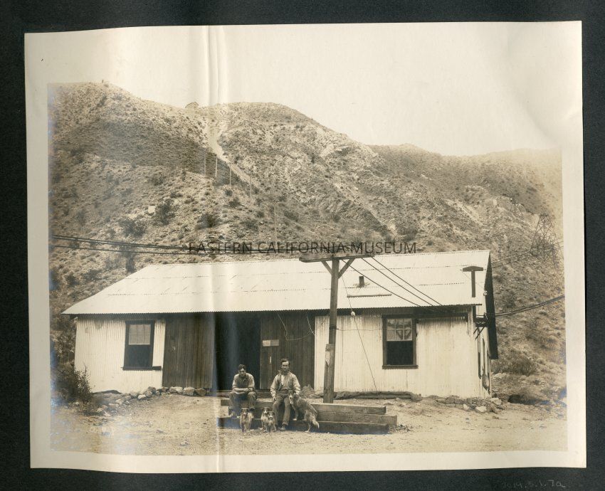 Photo of a wood and corrugated metal building with power lines going to and from it. Two men and four dogs are sitting on railroad ties in front of it. Hillside in the background. Has "A98" written in lower left corner.