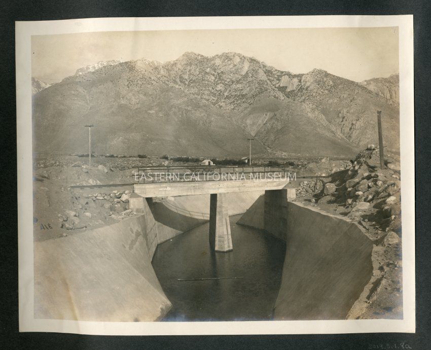 Photo of an open, lined section of the Los Angeles Aqueduct with a bridge crossing over it. Mountains and power or telephone poles in the background. There are also two tent cabins in the distance. The ground around the aqueduct looks freshly disturbed. Has "A18" written in lower left corner.