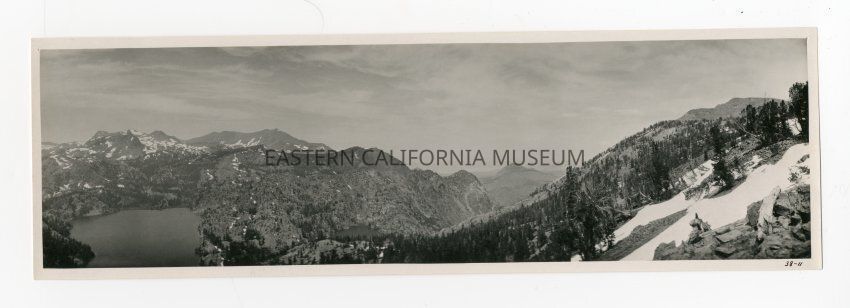 Photo taken from a high vantage point looking down at a lake and snowy mountainous landscape. Same location as 1993.45.47.