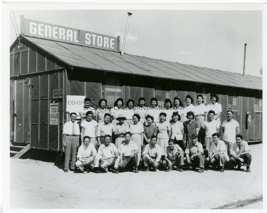 Group of people posing in front of the General Store and Co-Op at Manzanar War Relocation Center.