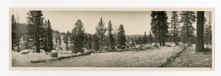 Photo of a packtrain in a forest. The trees are spaced out, and there's not much vegatation on the ground. Dry or low elevation, maybe?Made/Created