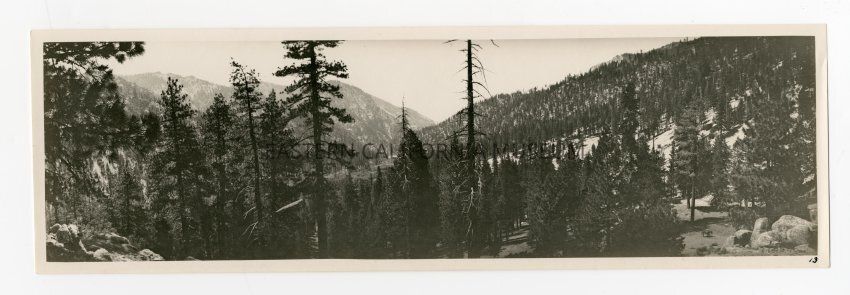 Photo of forest and mountain landscape. There is a horse at the bottom of the hill on the right side.