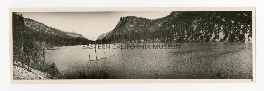 Photo of a mountain lake with trees right down to the edge of the water. There are some submerged trees in the lake.