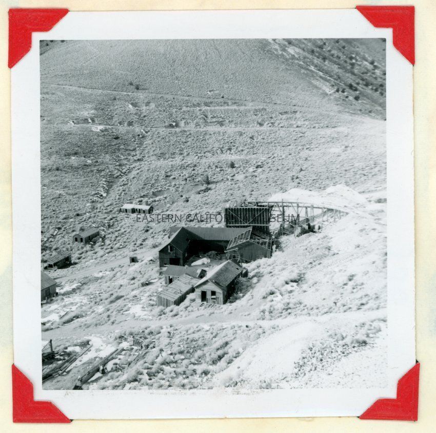 Photo of ore bins and tram house at Cerro Gordo taken from the hoist works in 1959. Photographer was C. Krautter.