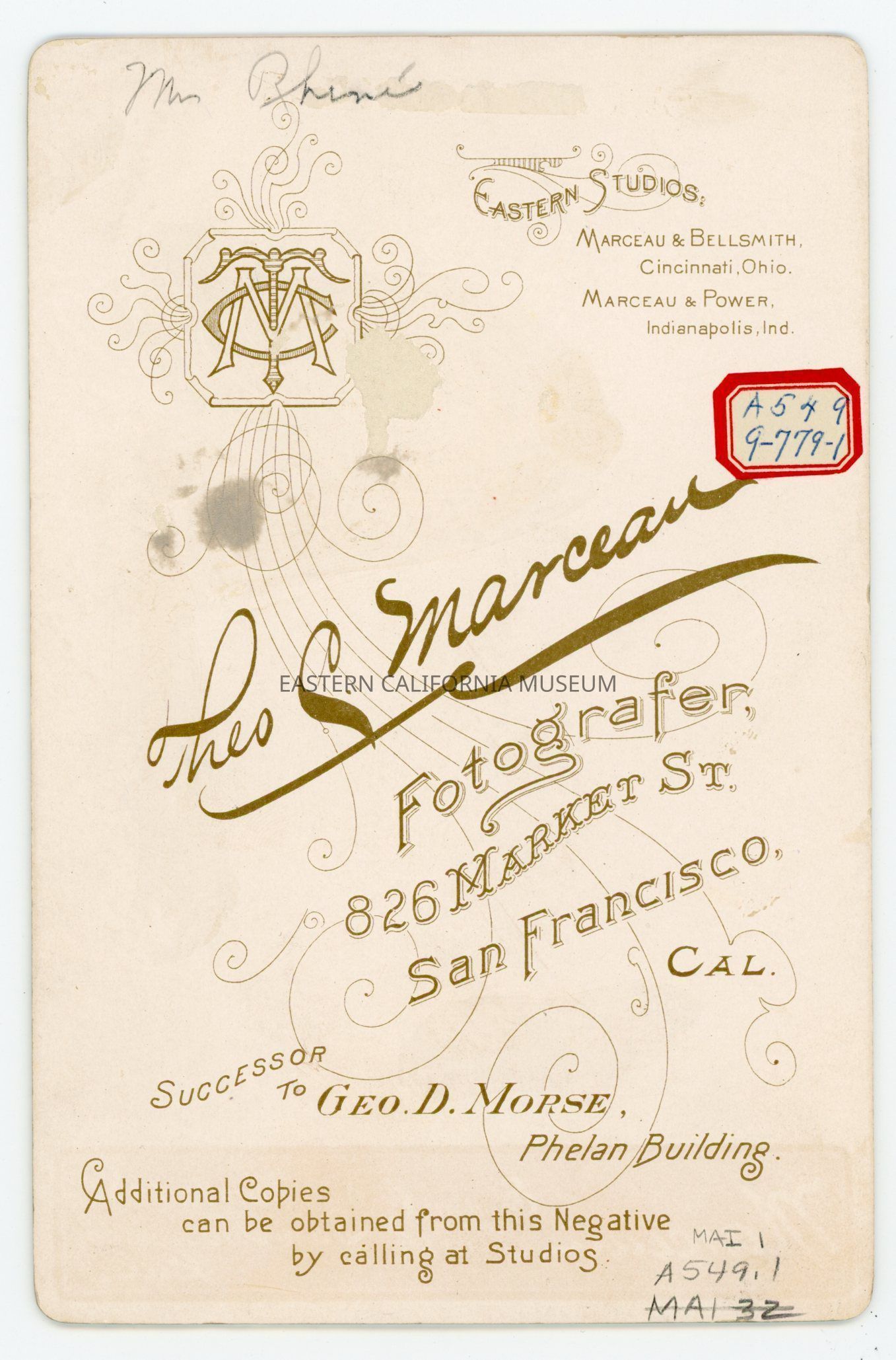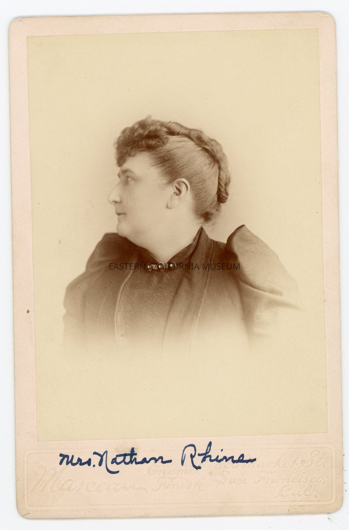 Mounted studio portrait of Mrs. Nathan Rhine in profile taken by photographer Marceau of San Francisco.Collection