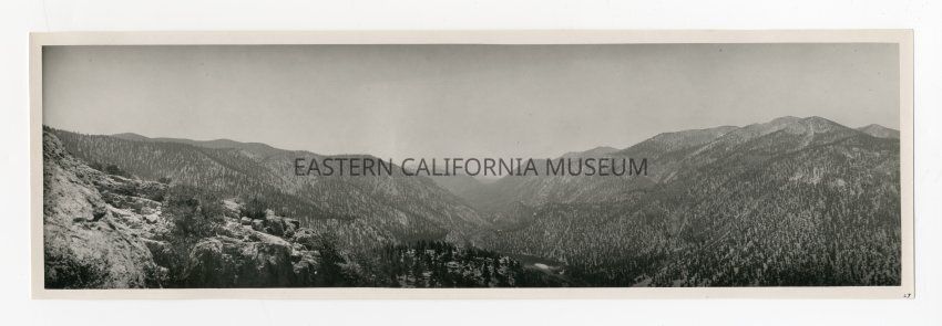 Photo taken looking out at a forested mountain vista with a lake in the center.