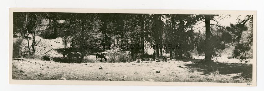 Photo of a couple men setting up a campsite among some trees. Horses and pack animals grazing around them.