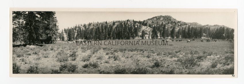 Photo of a packtrain and cattle in an open field. This location may be Summit Meadow.