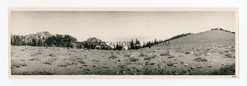 Photo of a packtrain on what appears to be the top of a mountain pass. This location may be Olancha Pass.