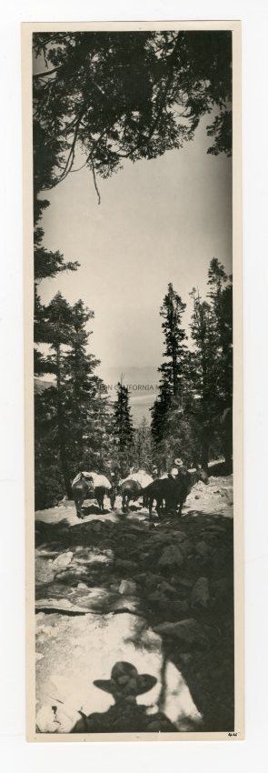 Photo of a packtrain descending a forested mountainside. The photographer's shadow is visible in the bottom. Same location as 1993.45.149.