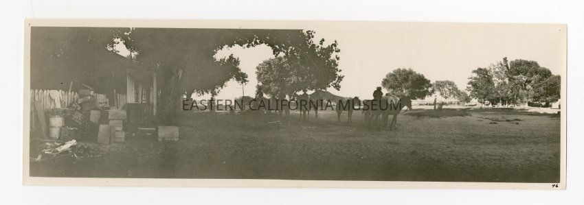 Photo of a packtrain in a town or ranch. There is a building to the left and several more in the background. Appears to be a water pump and trough in the center.