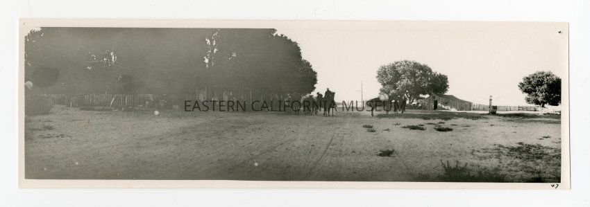 Photo of a packtrain in a town or ranch. There is a building to the left and several more in the background. Same location as 1993.45.152.