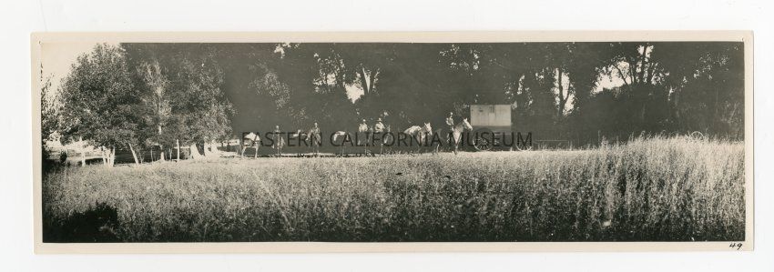 Photo of a packtrain and Wolfskill's travelling darkroom wagon. There is a fence to the left.