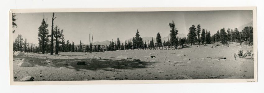 Photo of a packtrain in a what appears to be a mountain pass area. Trees, boulders, and mountain peaks in the distance.