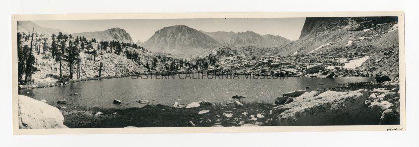 Photo of a mountain lake with rocks and boulders coming down to the edge of the water. Some small patches of snow nearby with mountain peaks in the distance.Made/Created