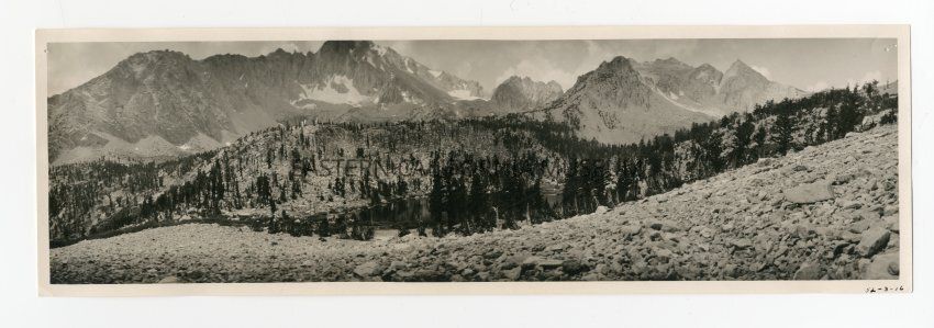 Photo of a mountain lake in a rocky mountain landscape. There is a wall of mountain peaks in the background.