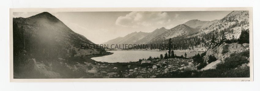 Photo of a lake surrounded by mountains and peaks. There is some overexposure or sun glare on the left side of the photo.