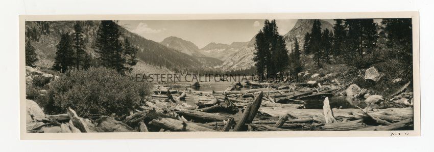Photo taken from the shoreline of a mountain lake with lots of logs floating in the foreground. Same location as 1993.45.192.