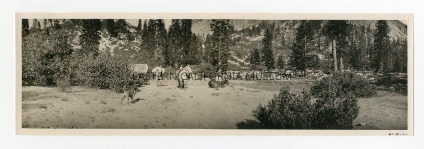 Photo of a packtrain and dog in a forest landscape. This location may be East Creek and Junction Meadow.