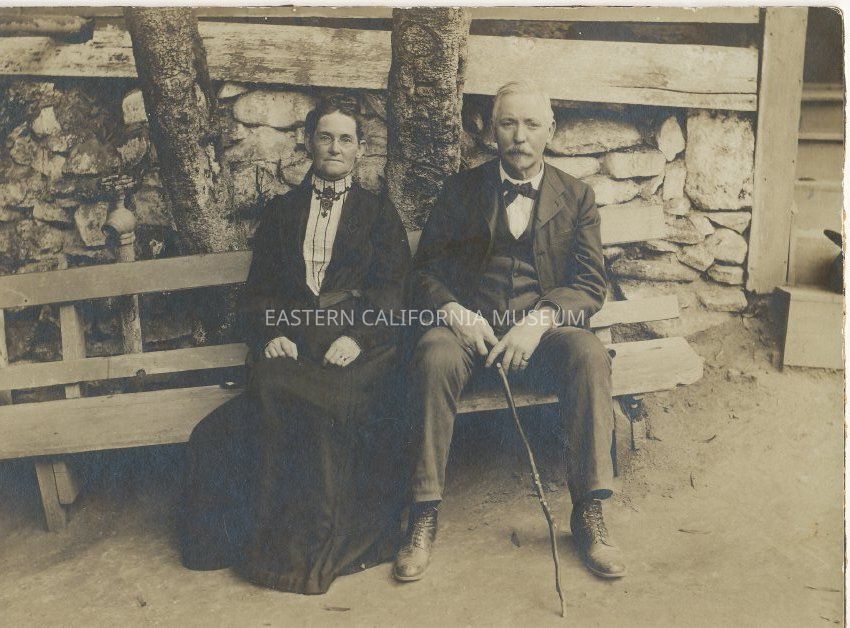 Photo of John Whitcomb Pierpont Laird, Inyo County Supervisor from 1874-1884, and his second wife, Laura Ann Farmer Dickinson, sitting on a rough wood bench in front of a building.