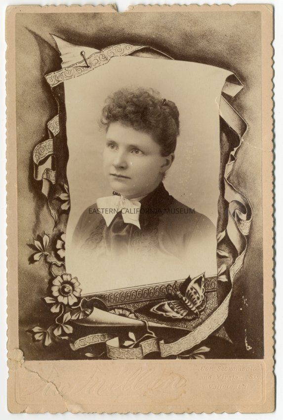 Mounted studio portrait of Ida McCall within an elaborate drawing of ribbon, flower, and butterfly. Photographer was [Charles] McMillan of Vallejo, CA.Made/Created