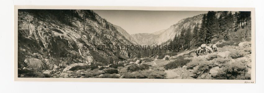 Photo of a packtrain in a canyon. This location may be the South Fork of Kings River Canyon and Paradise Valley.