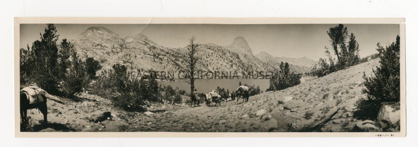 Photo of a packtrain with a lake and mountain peaks in the background. Same photo as 1993.45.6 and 1993.45.288.