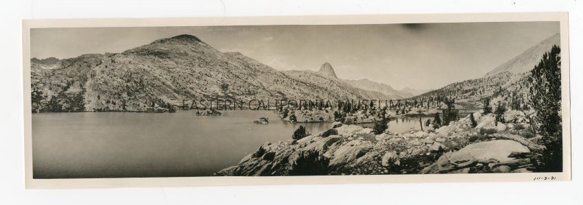 Photo of a large lake surrounded by rocky mountainsides. This location may be Fin Dome and Upper Rae Lake.