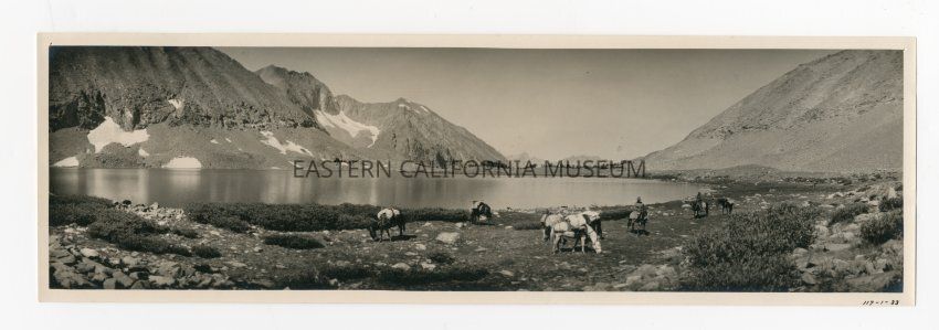 Photo of a packtrain next to a lake. There are patches of snow on the opposite side. Same photo as 1993.45.2.