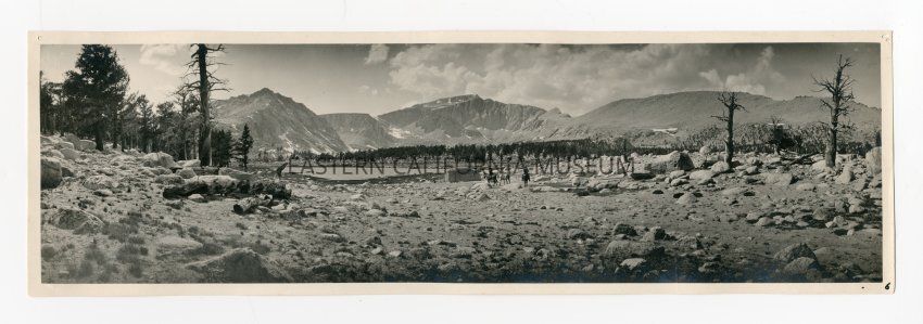Photo of a packtrain in a rocky landscape with a lake in front of them and mountains in the distance. Same location as 1993.45.243.