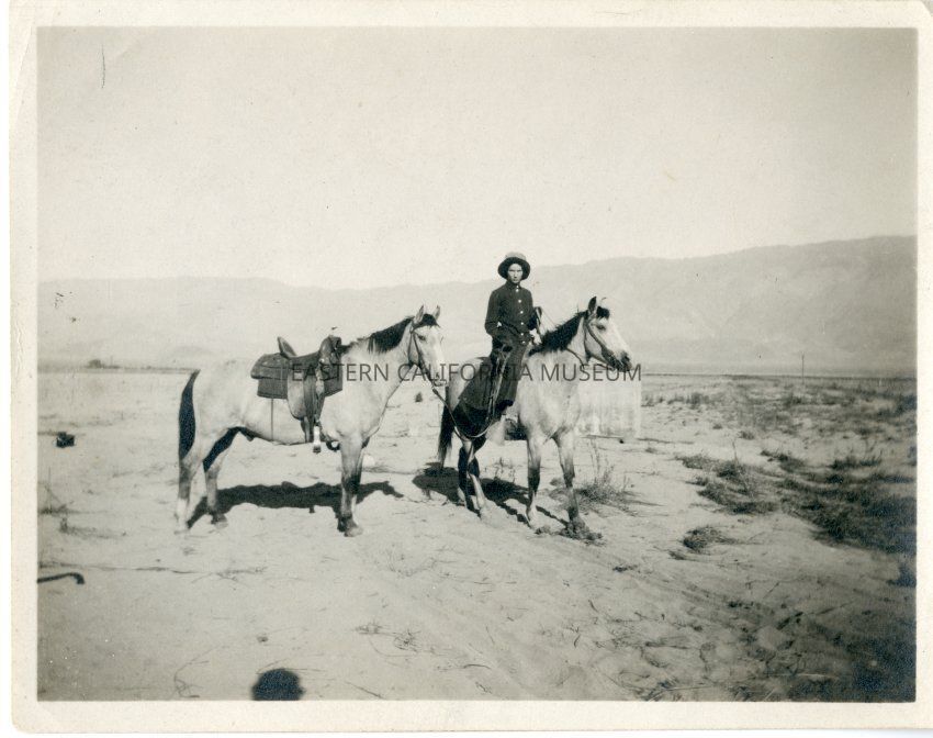 Photo of Francis Ward, the wife of J .L. Ward, on horseback holding the reins of (presumably) the photographer's saddled horse. The area is near the modern day location of the Manzanar War Relocation Center cemetery.Collection