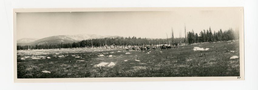 Photo of a packtrain crossing a grassy meadow. There are many boulders scattered throughout the field.