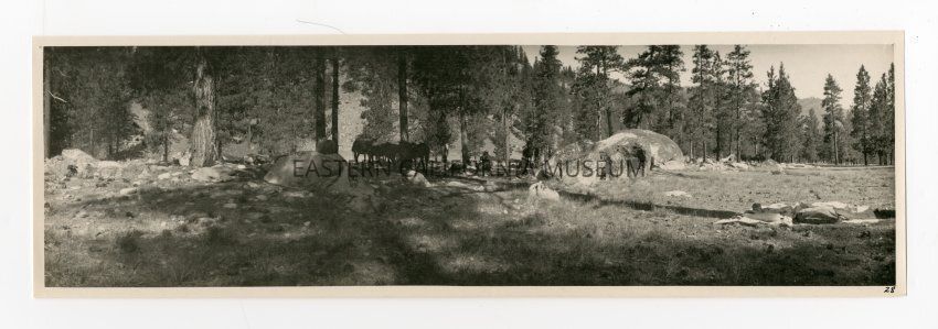 Photo of a packtrain at a campsite in a grove of trees. There are three people in the photo, and it looks like there are two bed rolls on the far right of the photo in the sunshine.