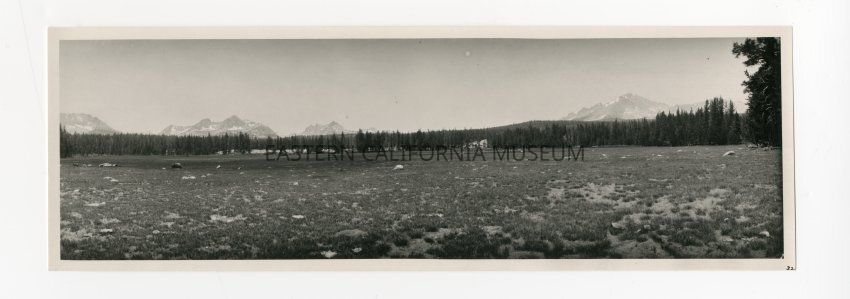 Photo of a wide open meadow with snow capped mountain peaks in the distance. This location may be Kern Canyon area.