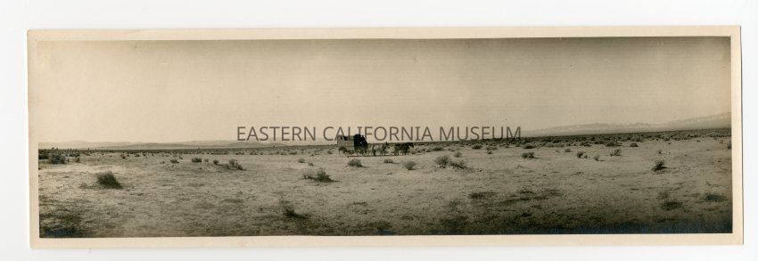 Photo of Matt Wolfskill's travelling darkroom wagon in the desert. The wagon is pulled by four mules and there are people sitting on the wagon.