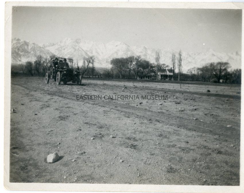 Photo of four people in a Stevens-Duryea automobile on the Shepherd Ranch near Manzanar. The blacksmith shop is on the far right and the ranch house is visible towards the uppper right.Collection