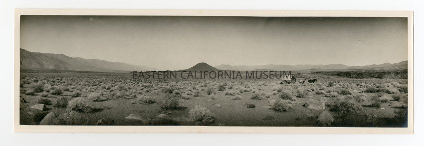 Photo of Matt Wolfskill's travelling darkroom wagon in a desert landscape with a volcano/cinder cone in the background.