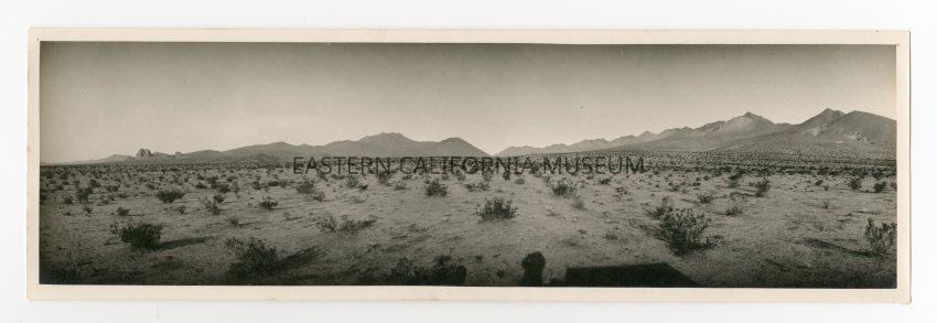 Photo of the desert landscape. The photographer's shadow (and maybe the shadow of Matt Wolfskill's travelling darkroom wagon) are in the foreground.