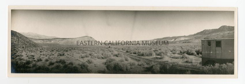 Photo of Matt Wolfskill's travelling darkroom wagon on a dirt road in the desert with a rider on horseback behind it.