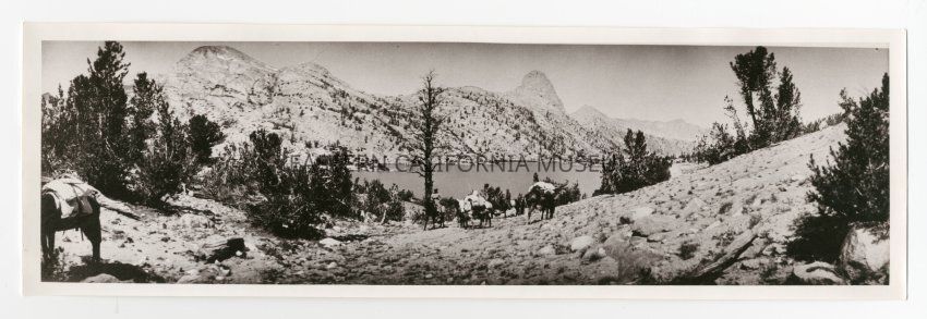 Photo of a packtrain with a lake and mountain peaks in the background. Same photo as 1993.45.6 and 1993.45.231.