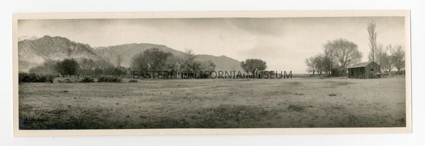 Photo of a ranch or small community with the Sierra Nevada range in the background. This location may be Olancha.