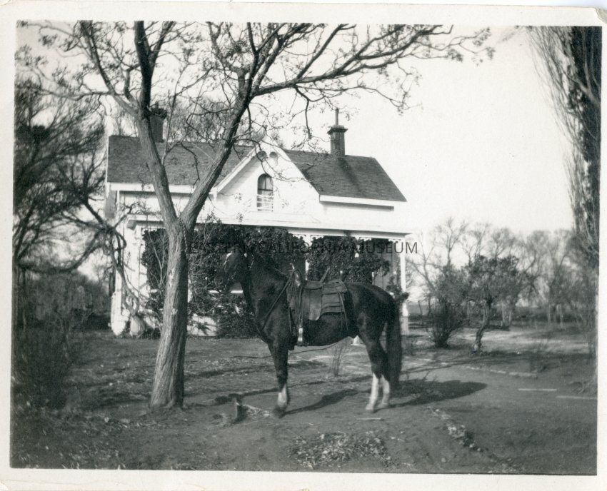 Photo of a black horse tied to tree in front of the Shepherd ranch house near Manzanar.