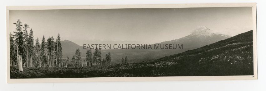 Photo of snow capped Mt. Shasta with forest in left foreground.
