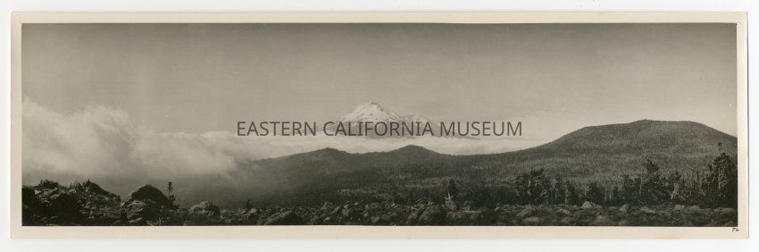 Photo of snow capped Mt. Shasta. The peak is rising above a layer of clouds.