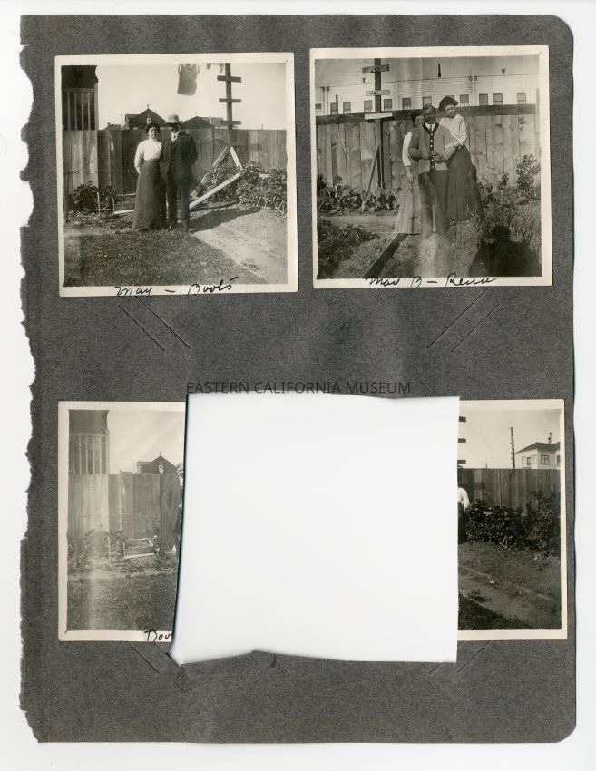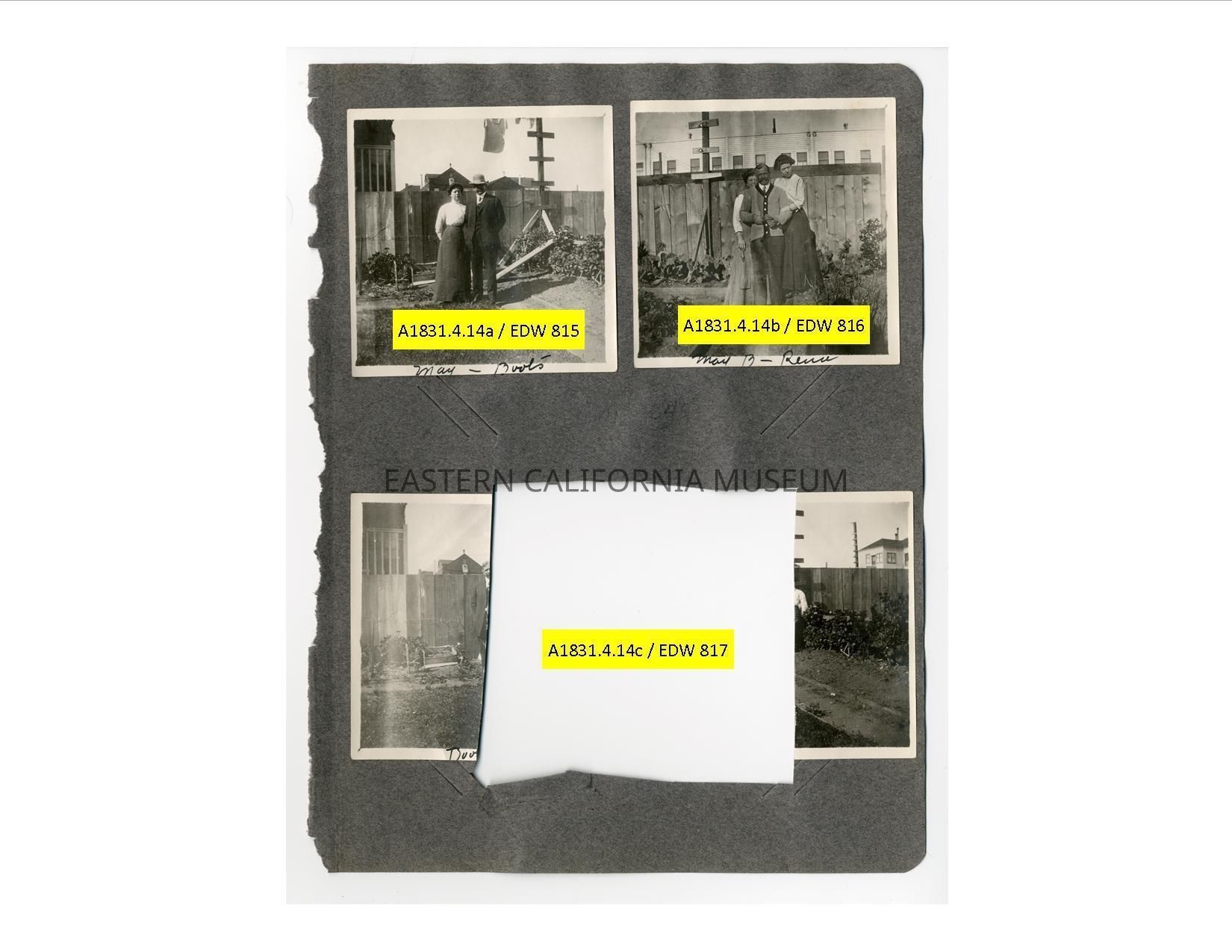 A1831.4.14c: Remains of one or two photos that have been sacrificed to cut out a photo on the reverse side of the photo album page. Photo(s) taken in same location as other photos on this album page, and the man, Boots (?), is partially visible on the left and a woman (either May or Rena) is partially visible on the right.Collection