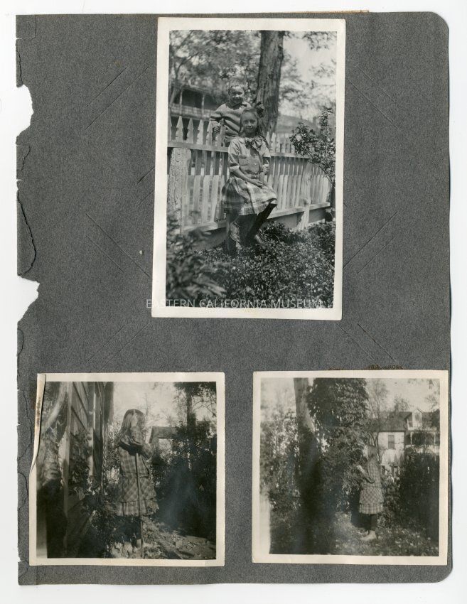 A1831.4.28a: Exterior photo of a young girl and boy posing next to the white picket fence at the Edwards House in Indpendence. The Norman House (hotel) is visible in the background.