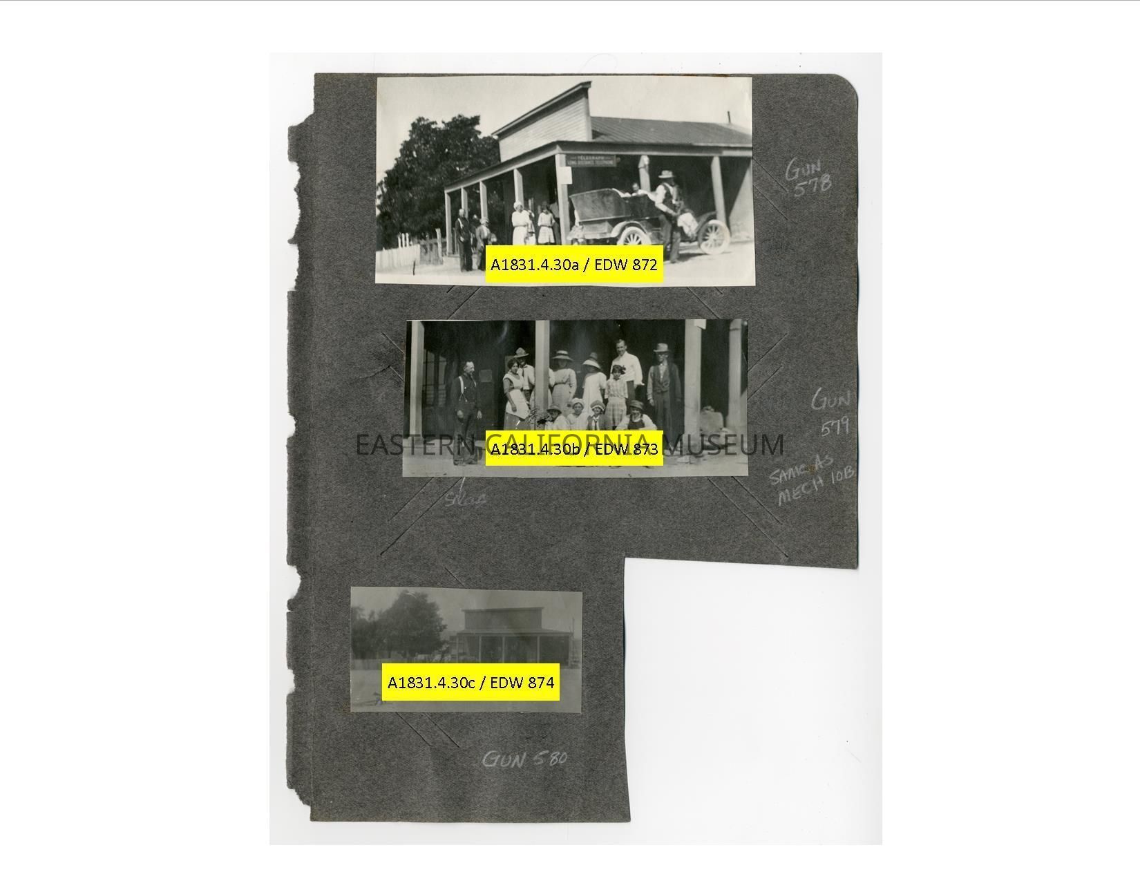 A1831.4.30c: Small, dark photo of a building with some pack animals in front. Appears to be the same building as others on this album page. Location may be the town of Darwin.Collection